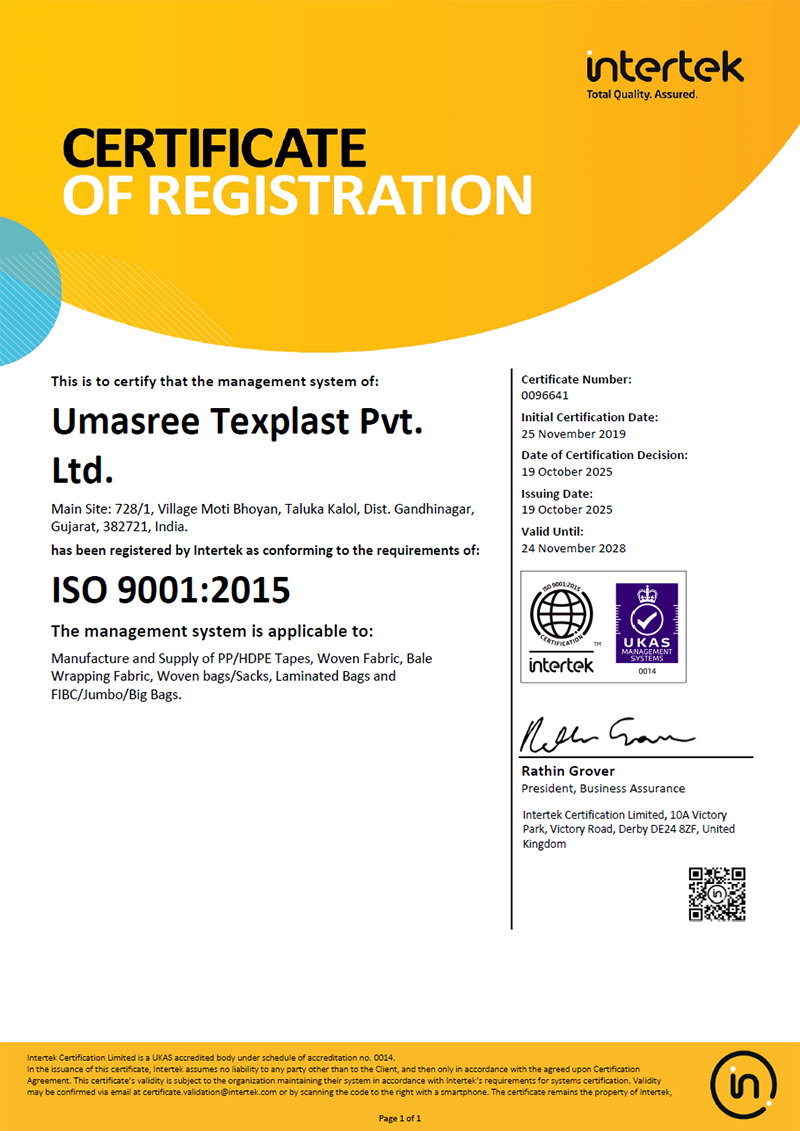 We believe 'Quality Assures Alliances'. It is the benchmark of lasting partnerships. For this very reason, Quality is the epitome of our system. Right from procurement, to manufacturing, to delivery, all the way to aftersales service, we have the values of highest quality imbibed in every facet of our business. From cutting-edge, in-house testing lab to physical quality control by skilled engineers and technicians, all products have to pass through string monitoring phases, to ensure every FIBC from Umasree is as per international standards. One of the biggest strengths of our quality protocols is third party audit. We employ reputed external quality inspectors, who report directly to the top management, thus ensuring that all our processes are always in immaculate conditions. In addition, we also use superior grade polymers and other additive materials combined with our world-class processing technologies, throughout our manufacturing activities.